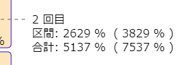 タイムライン右側の数値表示は、任意のアタック回数において飴何個分のダメージを与えられる予定かを表しています。 区間は1つ前のアタックからの差分値で、合計はすべてのアタックを合計したトータルのダメージ数値です。左側はダメージ声援の合計%値で、右側はさらに飴や炭酸などによる通常のアタック分も加算した数値です。